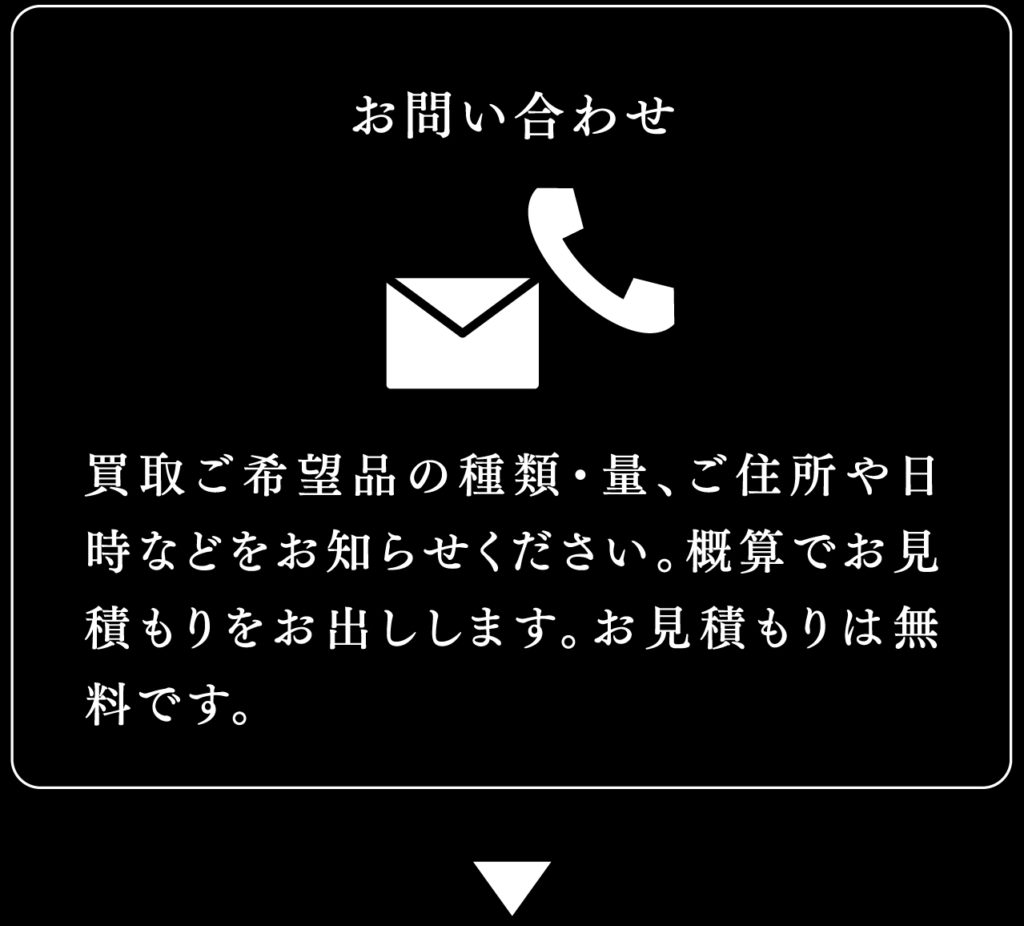 買取ご希望品の種類・量、ご住所や日時などをお知らせください。概算でお見積りをお出しします。